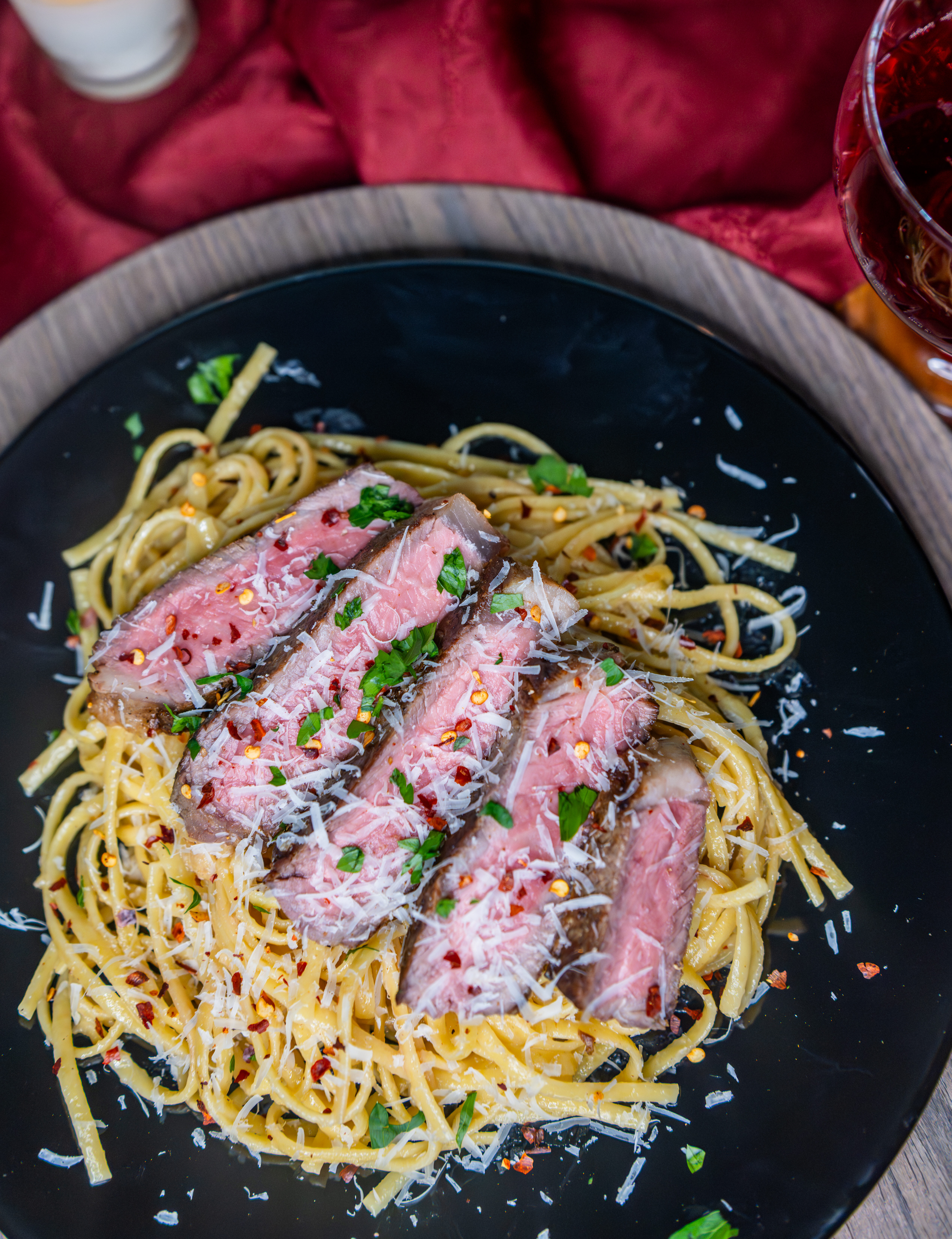 - Serve pasta and top with steak slices. Garnish with parsley and extra grated parmesan cheese if desired.
