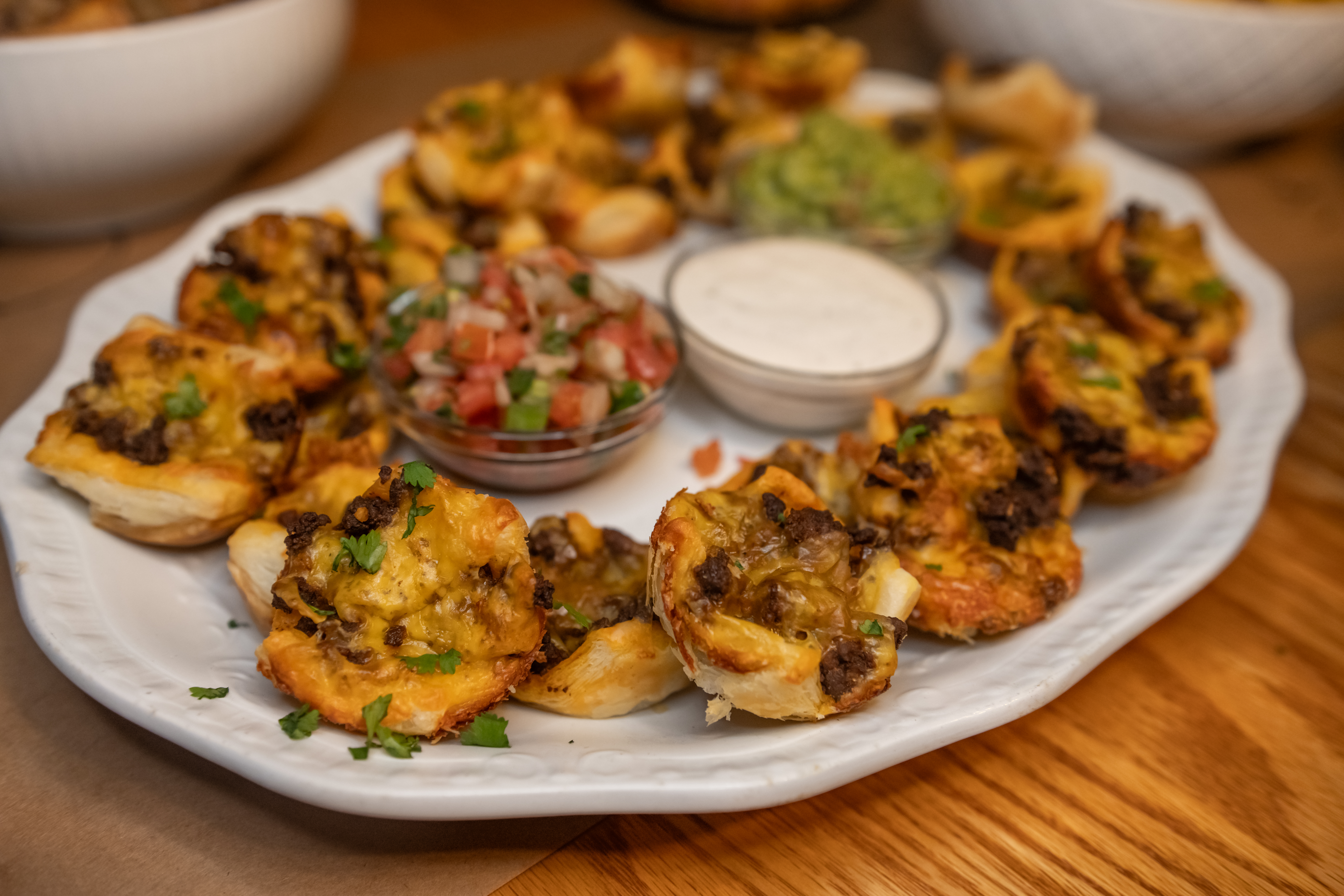 Bring the heat to game day with these Taco Bites—a quick, cheesy, handheld win for any crowd. Crispy crescent dough cups are filled with seasoned beef and a melty cheddar and mozzarella blend then baked to golden perfection. Easy to customize with dips like salsa, guac, or ranch, they’re the ideal grab-and-go snack for cheering fans.